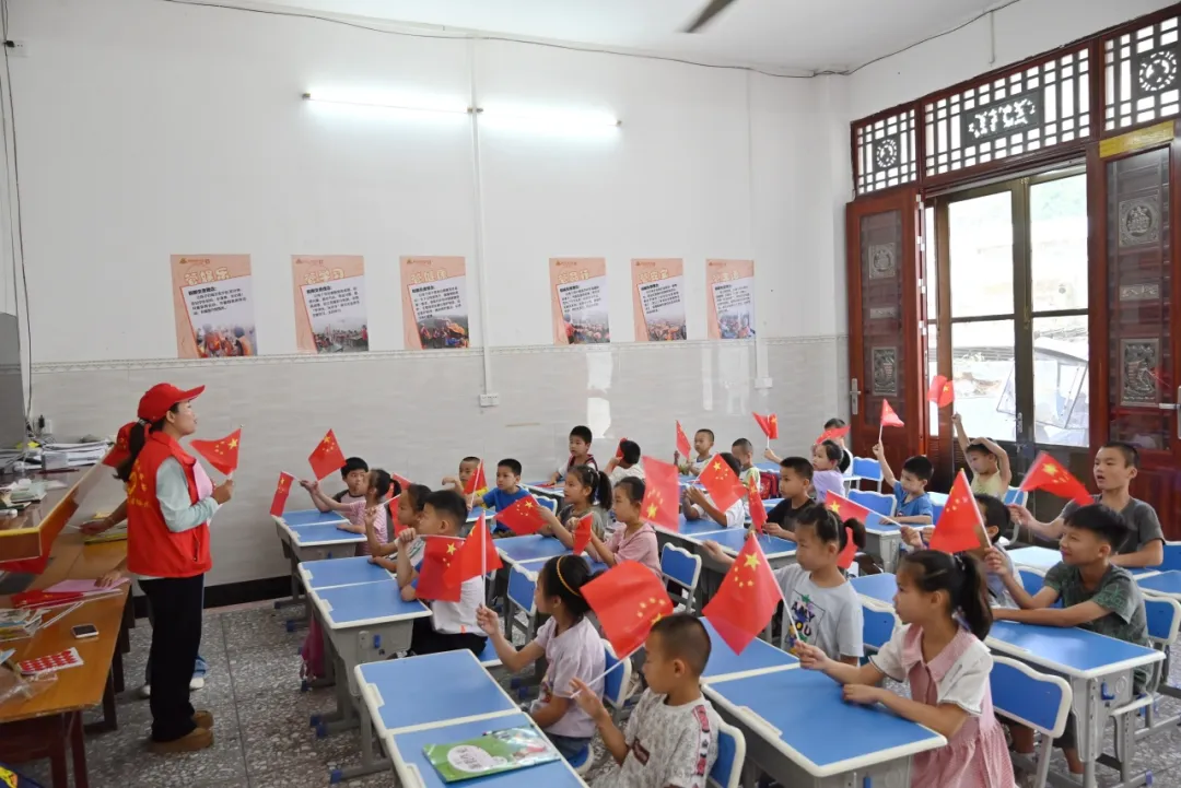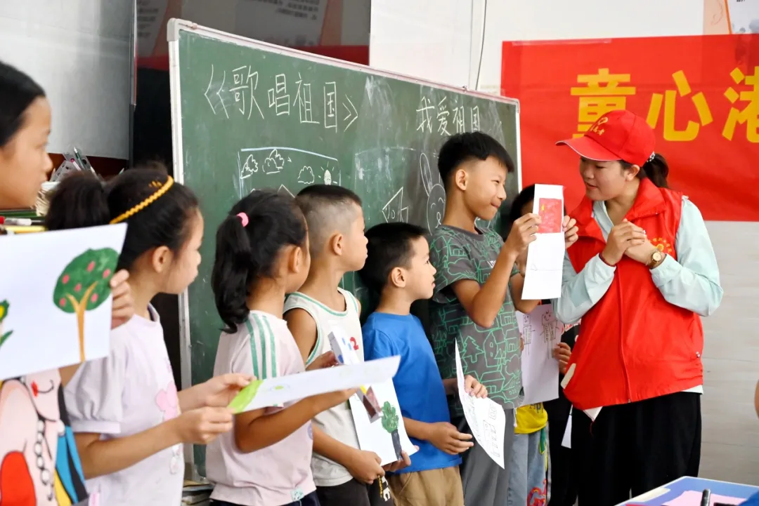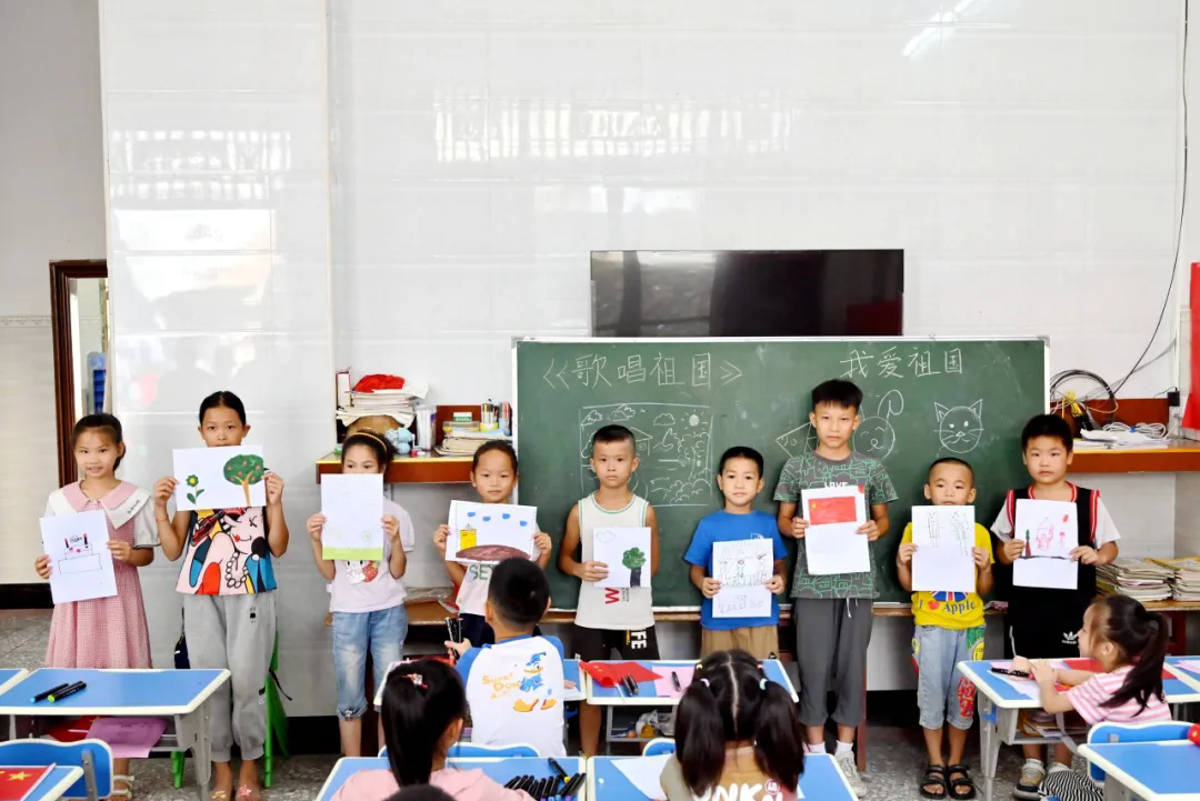 實踐團、服務(wù)團成員們耐心教小朋友們唱歌、畫畫、朗誦,現(xiàn)場洋溢著學(xué)習(xí)的歡樂和濃厚的愛國情感