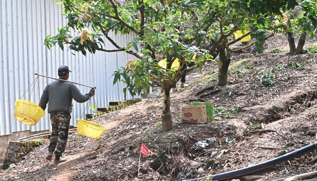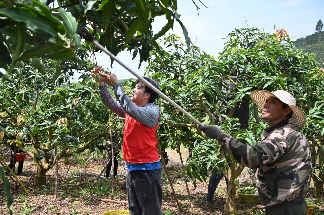 盛夏的百冠那朗芒果基地,金黃的芒果掛滿枝頭,散發(fā)出陣陣果香。實(shí)踐團(tuán)成員們?cè)诠r(nóng)的指導(dǎo)下,拿起工具,開(kāi)始了芒果采摘工作。