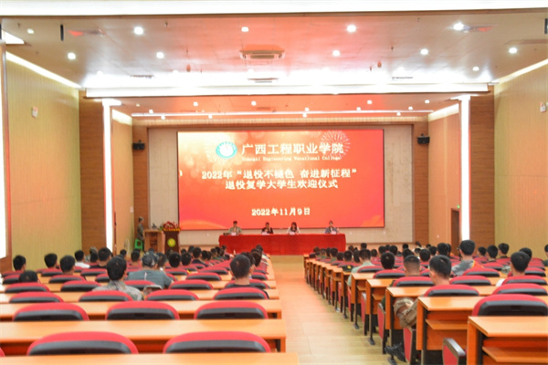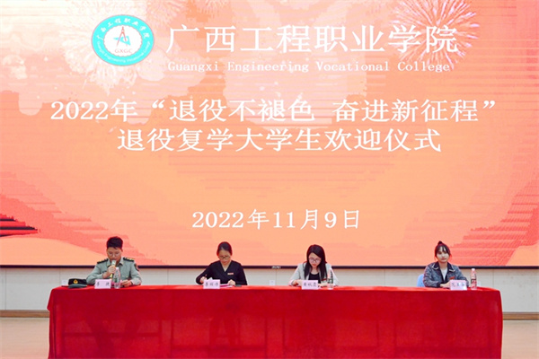 為弘揚(yáng)廣西工程職業(yè)學(xué)院學(xué)子積極參軍、報(bào)效祖國的優(yōu)良傳統(tǒng),營造尊崇軍人濃厚氛圍,進(jìn)一步做好退役復(fù)學(xué)學(xué)生的服務(wù)工作,11月9日下午,學(xué)校在圖文信息大樓一樓學(xué)術(shù)報(bào)告廳召開了2022年退役復(fù)學(xué)大學(xué)生“退役不褪色 奮進(jìn)新征程”歡迎會(huì)。黨委副書記黃秋霞,黨委委員、學(xué)生工作處副處長李麗詩,國防科技學(xué)院副院長李捷、學(xué)工處資助科科長范玉翠出席歡迎儀式,各二級學(xué)院學(xué)生科長、22級輔導(dǎo)員及2022年退役復(fù)學(xué)大學(xué)生參加了歡迎儀式。李捷副院長主持儀式。