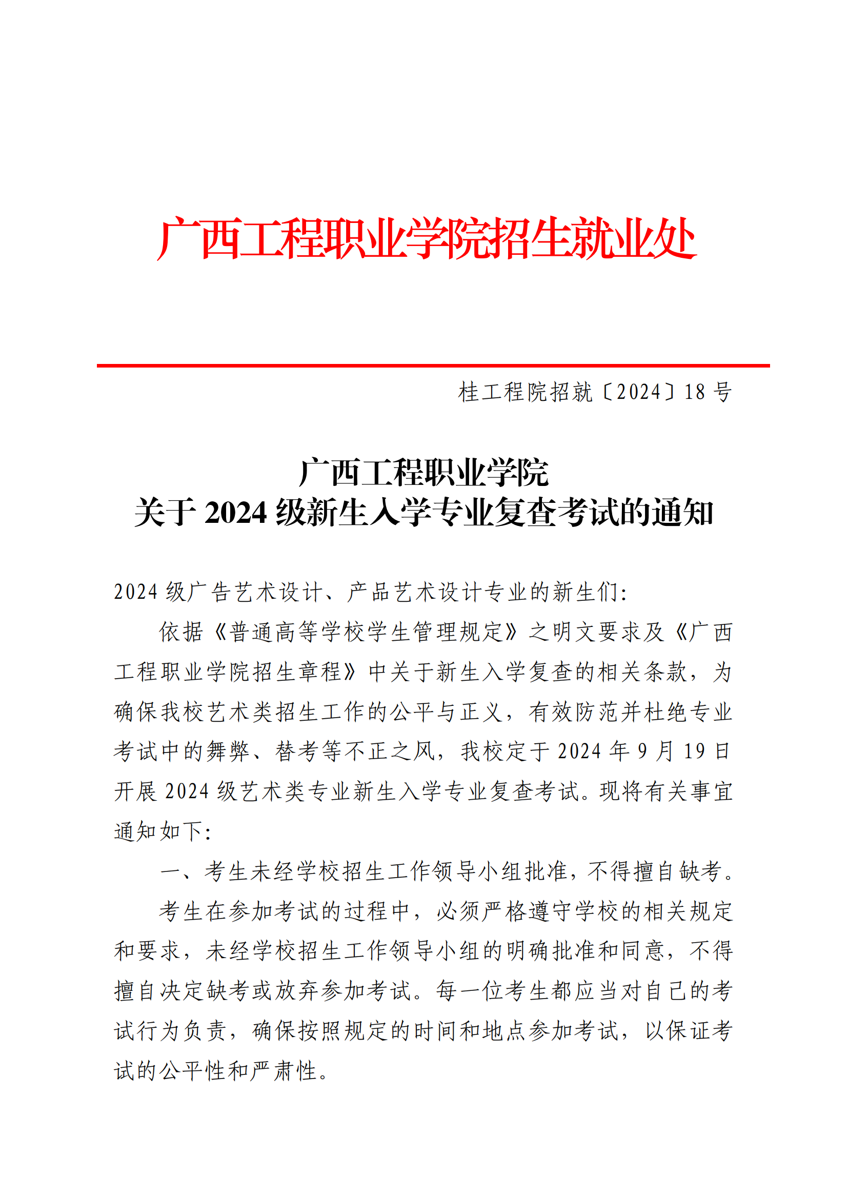 廣西工程職業(yè)學(xué)院關(guān)于2024級新生入學(xué)專業(yè)復(fù)查考試的通知